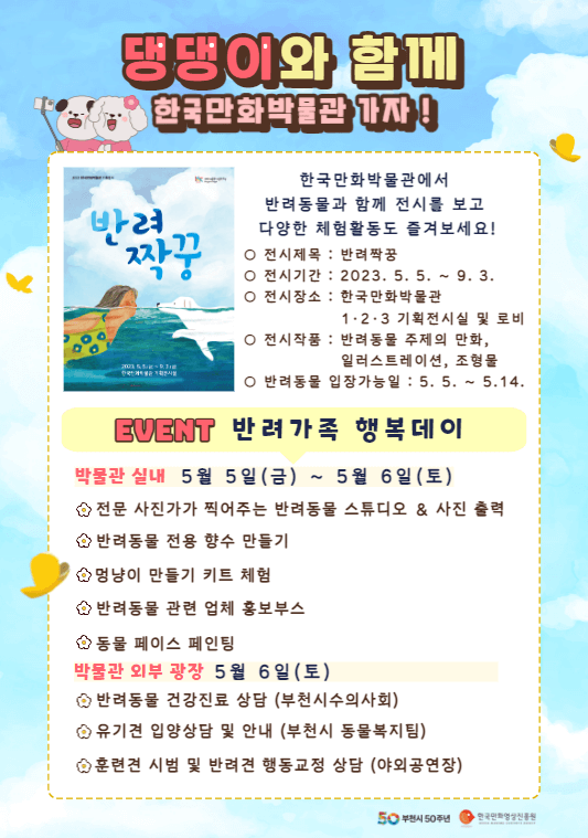 5월 5일부터 6일까지 한국만화박물관 실내에서 반려견을 키우시는 가족들을 위해 전문 사진가가 오셔서 사진도 찍어주고 출력까지 해준다고 합니다. 또 향에 민감한 반려견을 위한 전용 향수 만들기 체험과 멍냥이 만들기 키트 체험, 반려동물 관련 업체들이 와서 다양한 홍보부스가 열릴 예정입니다. 동물 페이스 페인팅도 그려준다고 합니다. 관심가시는 분들은 꼭 오셔서 체험하고 가시기 바랍니다. 6일 토요일에는 박물관 외부 광장에서 반려동물 건강진료 삼담을 진행한다고 합니다. 부천시수의사회에서 오신다고 합니다. 또한 부천시 동물복지팀에서 유기견 입양상담 및 안내도 진행됩니다. 야외공연장에서는 훈련견 시범 및 반려견 행동교정 상담이 진행된다고 합니다.