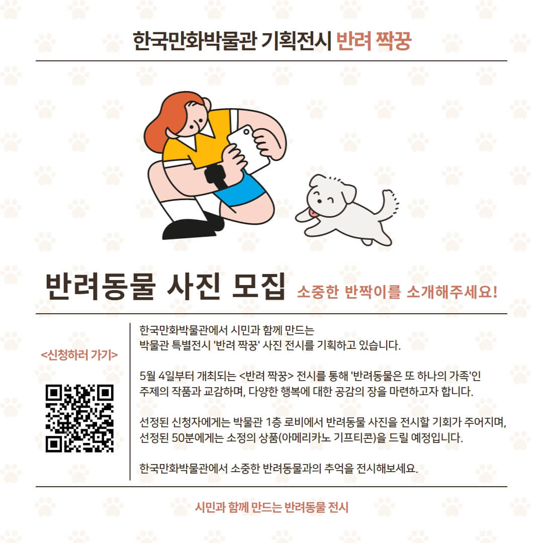 한국만화박물관에서 가정의 달을 맞이하여 '반려동물은 또 하나의 가족'이라는 주제로 전시회를 기획했다고 합니다. 전시회의 내용은 반려동물을 입양하고 함께 즐거운 일상을 보내고 늙은 반려동물을 책임지는 삶의 내용의 만화와 미술작품입니다. 반려동물과 같이 입장해서 감상하실 수 있습니다. '반려짝꿍' 사진전에서는 미리 반려동물 사진을 모집한다고 합니다. 모집인원은 50명이고 구글폼으로 신청서를 작성하시면 됩니다. 한 사람당 여러 마리 응모가 가능하다고 합니다. 업로드되는 사진은 고화질로 부탁드립니다. 최대 3장까지 등록 가능합니다. 접수 마감은 5월 3일 오후 5시까지입니다. 발표는 5월 중이며 선정된 50인에게는 개별 연락드린다고 합니다. 선정되신 분들에게는 소정의 상품으로 아메리카노 기프티콘을 드릴 예정입니다. 반려동물과 교감하며 행복한 시간을 만드셔서 소중한 추억을 만드시기 바랍니다. 문의사항은 nova961@komacon.kr / 032-310-3045, 3044 이쪽으로 연락 바랍니다.