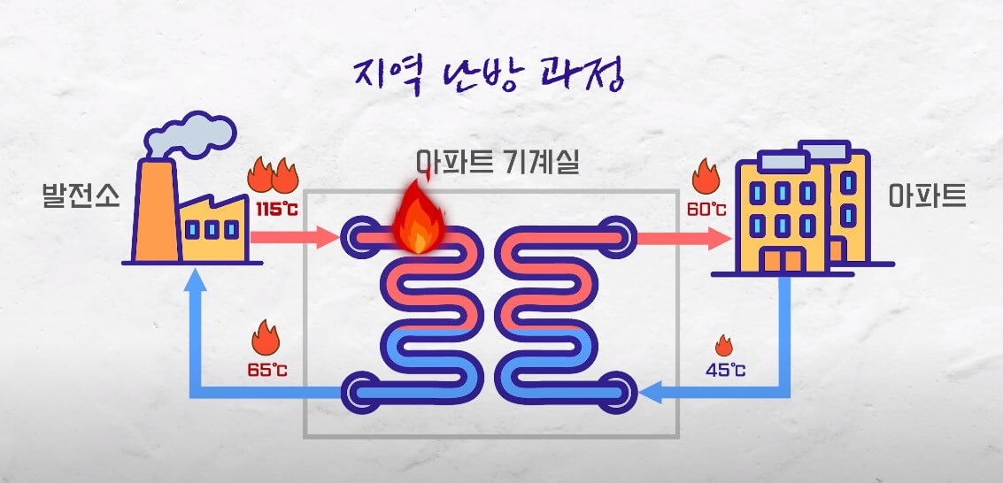 하지만 개별 난방 다음으로 많은 분들이 사용하고 있는 지역난방은 절약법이 다릅니다. 그 이유는 지역난방은 인근 발전소에서 물을 한 75도에서 115도 사이로 가열을 해서 아파트로 보내게 되는데 아파트에서는 이 물을 이용해 가지고 세대별 난방이나 온수에 사용합니다. 그래서 이렇게 발전소에서 아파트 전달되는 물을 중 온수라고 합니다. 이 발전소에서는 중온수의 온도를 올리기 위해서 LNG 천연가스를 사용합니다. 발전소에서 아파트 기계실로 공급된 중온수는 아파트 기계실에서 난방에 사용되는 난방수를 약 60도로 따뜻하게 만들어주고 다시 발전소로 회수가 됩니다. 그래서 우리는 이 난방수를 얼마큼 쓰느냐에 따라 아파트라면 관리비에 포함돼서 난방비를 내게 되는 것입니다.