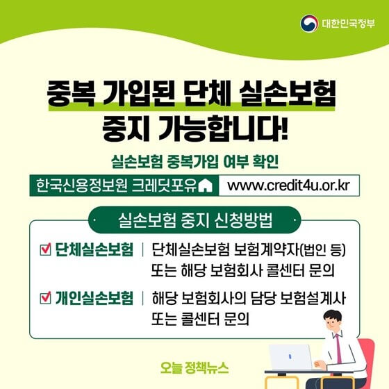 중복 가입된 단체 실손보험 중지가 가능합니다. 실손보험 중지 신청은 한국신용정보원 크레딧포유에서 하시면 됩니다. 단체실손보험은 단체실손보험 보험계약자(법인 등) 또는 해당 보험회사 콜센터에 문의하시고 개인실손보험은 해당보험회사의 담당 보험 설계사 또는 콜센터에 문의하시기 바랍니다.