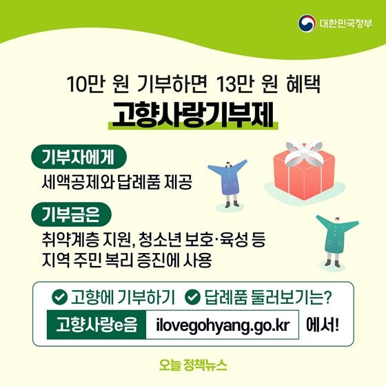 10만원을 기부하면 13만 원 혜택을 받을 수 있는 고향사랑기부제가 있습니다. 기부자에게는 세액공제와 답례품을 제공하며 기부금은 취약계층을 지원하고 청소년 보호와 육성 등 지역 주민의 복리 증진에 사용된다고 합니다. 고향사랑 e음에서 기부하고 답례품도 보실 수 있습니다.