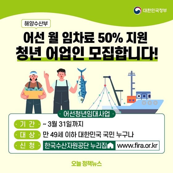 어선 월 임차료 50% 지원하는 청년 어업인 모집을 모집한다고 합니다. 어선 어업을 희망하는 청년들에게 임차료를 지원해 줌으로써 어선어업의 진입장벽을 낮추고 청년 일자리 창출에 기여하며 연안어업 활성화에 많은 도움이 될 수 있는 사업입니다. 23년 3월 31일까지이고 만 49세 이하 대한민국 국민이라면 누구나 대상입니다. 신청은 한국수산자원 공단 누리집에서 하실 수 있습니다. 문의는 한국수산자원공단 어선어업진흥실 (051-718-2408)로 하시기 바랍니다.