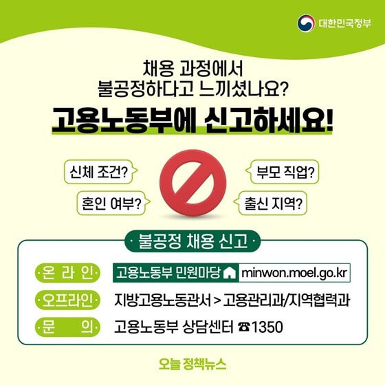 채용과정에서 불공정함을 느끼셨다면 고용노동부에 신고하실 수 있습니다. 온라인으로는 고용노동부 민원마당에서 가능하시고 오프라인에서는 지방고용노동관서 고용관리과 지역협력과에서 신고하실 수 있습니다. 문의는 고용노동부 상담센터(1350)로 하시기 바랍니다. 고용노동부 누리집 바로가기