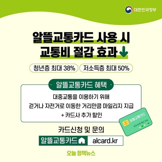 대중교통을 이용하기 위해 걷거나 자전거로 이동한 거리만큼 마일리지가 지급되고 카드사 추가 할인이 가능합니다. 알뜰교통카드 사용 시 교통비 절감 효과가 발생하고 청년층은 최대 38%, 저소득층은 최대 50%까지 할인이 가능하다고 합니다. 카드 신청 및 문의는 알뜰교통카드 홈페이지를 이용하시기 바랍니다.