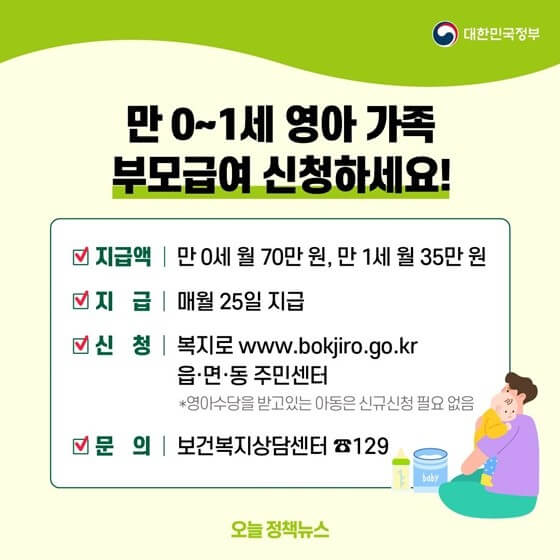 만 0~1세 영아 가족 부모급여 신청이 가능합니다 만 0세는 월 70만 원, 만 1세는 월 35만 원 지급받을 수 있습니다. 매월 25일 지급되고 신청은 복지로 또는 읍면동 주민센터에서 가능합니다. 영아수당을 받고 있는 아동은 신규신청이 필요 없다고 합니다. 문의는 보건복지상담센터(129)로 하시기 바랍니다.