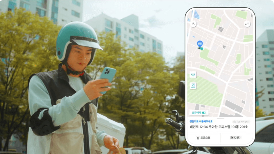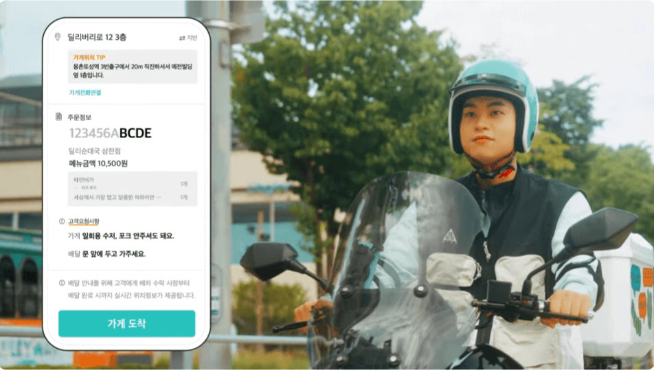 배달 준비가 끝나면 운행 시작 버튼을 눌러주시기 바랍니다. AI 추천 배차 모드로 나에게 맞는 배달을 추천받고 배차 수락 버튼을 누릅니다. 안전을 위해 헬멧과 안전 장비를 꼭 착용해 주세요. 길 찾기 기능을 사용하세요. 내비게이션과 연동되어 목적지를 찾을 수 있게 도와줍니다. 배달 상세 화면에서는 주문 정보와 고객 요청 사항 등을 확인할 수 있습니다. 픽업 장소에 안전하게 도착 후 가게 도착 버튼을 눌러주세요. 음식을 배달 가방에 걸어 안전하게 고정해 줍니다. 전탈지로 출발하기 전 픽업 완료 버튼을 눌러주세요. 길 찾기 기능을 활용하여 전탈지로 안전하게 이동합니다.