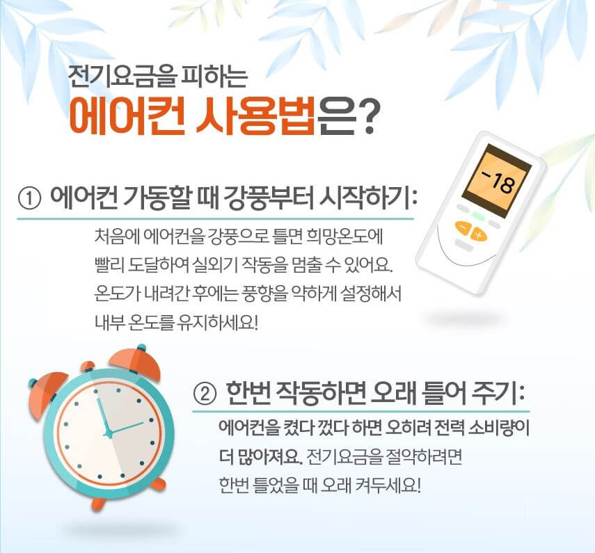 더워서 숨이 턱턱 막히는 요즘 문득 그런 생각이 들었습니다. 아니 이렇게 더운데 선풍기나 에어컨이 없던 옛날에는 어떻게 살았을까 하고 말이지요. 우리가 쌩쌩했던 어린 시절에는 선풍기만 틀고도 잘 살았던 것처럼 평균 연령이 더 낮았던 예전에는 조금 버틸만했던 걸까요. 하지만 그것은 틀렸습니다. 나이가 들어서 온도에 더 민감해진 것도 사실이겠지만 실제로 현대에 들어오면서 온도가 급속도로 올라갔는데요. 조선 시대에 기록물인 하멜표류기에는 음력 6월 양력으로 7, 8월쯤인 한여름의 강원도에는 서리가 내릴 정도로 추웠다고 합니다. 폭염에 쓰러지는 노년층이 점점 더 뉴스에 많이 나오는 것 같은 것은 단순히 기분 탓이 아니었습니다. 열대기후에서만 나타난다는 엘니뇨 현상도 나타난다니 이상기후가 현실이 되고 있는 것입니다. 현실이 된 이상기후, 똑똑하게 대처하는 방법은 무엇이 있을까요? 그래서 요즘은 집집마다 에어컨을 쓰지만 이 또한 걱정되는 것은 마찬가지입니다. 전력 공급 부족으로 전기세가 많이 올랐기 때문입니다. 그래서 전기세를 아끼려고 처음에는 세게 틀고 어느 정도 온도가 내려가면 약하게 틀거나 습한 날씨에 제습 모드를 강하게 틀어놓는 경우가 많은데요. 하지만 이런 사소한 행동들이 오히려 전기세를 더 많이 나오게 할 수도 있다는 사실을 알고 계셨을까요? 특히 일정 전력 이상을 사용하면 누진세가 적용되게 일정한 양으로 사용하는 것이 좋습니다. 오늘은 저렴하면서도 시원한 여름을 보내는 방법에 대해 알아보겠습니다.