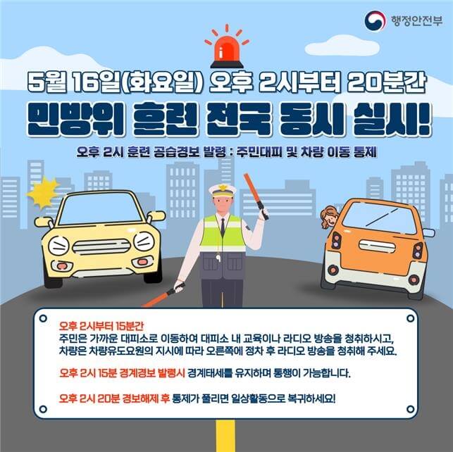 또한 민방공 대피 훈련을 진행할 때 군·경 합동 교통통제소 설치해 운영하게 됩니다. 군과 경찰은 원활한 군사 작전 수행을 위해 한강의 주요 교량을 통제하는 훈련을 진행하게 됩니다. 민방공 대피 훈련이 종료된 후에는 주민과 차량통제를 해제합니다. 민방공 대피 훈련은 생존 훈련이고 자기 보호 훈련입니다. 내가 안전해야 내 가족, 내 이웃, 그리고 국가사회를 위협으로부터 안전하게 지켜낼 수 있습니다. 5월 16일 오후 2시 20분의 기적이 곧 시작됩니다. 함께 안전서울 만들기에 참여합시다.