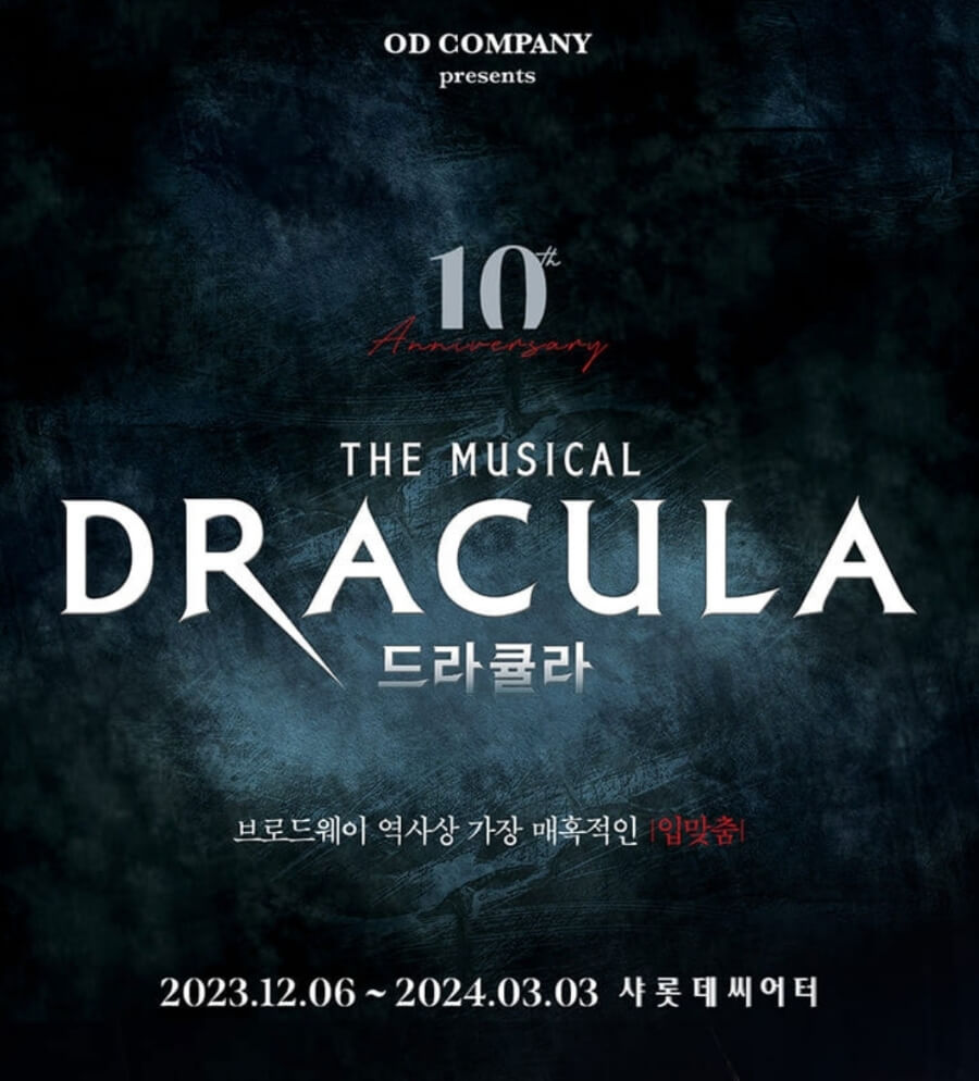 오늘 소개할 뮤지컬은 올해 국내에서 10주년을 맞이한 뮤지컬 드라큘라입니다. 오디컴퍼니에서 제작했습니다. 2023년 12월 06일부터 24년 3월 3일까지 샤롯데시어터에서 공연할 예정입니다. 벌써부터 티켓팅이 치열한 걸로 알고 있습니다. 이번 드라큘라 배역에는 김준수, 전동석, 신성록 배우님 출연하시는데 4연때와 똑같습니다. 미나역에는 임혜영, 정선아, 아이비 배우님이 반 헬싱역에는 손준호, 박은석 배우님이 조나단역에는 진태화, 임준혁 배우님이 루시역에는 이예은, 최서연 배우님이 렌필드역에는 김도현, 김도하 배우님이 함께 극을 만들어갈 예정입니다.