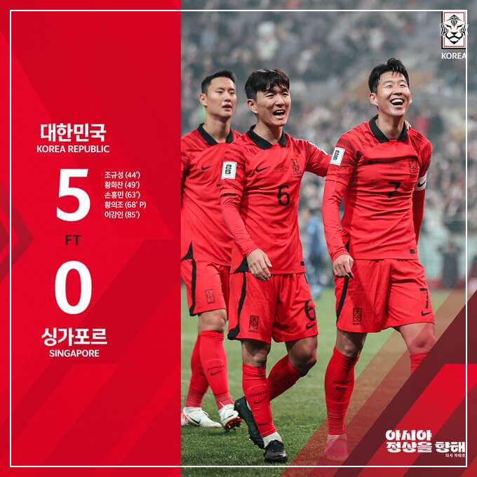 대한민국은 1990년 FIFA 월드컵 예선에서 벌어진 싱가포르와 대결해서 3-0으로 승리를 거둔 적이 있습니다. 위르겐 클린스만 감독이 이끄는 대한민국 축구 대표팀이 11월 16일 서울 월드컵 경기장에서 예선 2라운드 C조 첫 경기가 치러졌습니다. 대한민국은 싱가포르를 5-0으로 이기고 첫 승리를 거뒀습니다. 하루종일 비가 내려 기온이 떨어져 있었고 원정팀인 싱가포르나 대한민국 선수들 모두에게는 가혹한 날씨였습니다. 서울 월드컵 경기장은 6만 4천여 관중이 자리를 빛내주었습니다. 싱가포르 감독은 일본 출신인 위르겐 클린스만으로 싱가포르의 견고한 5-4-1 포메이션으로 골문을 뚫기는 쉽지 않았스니다. 전반 종료직전 이강인이 오른쪽에서 전방으로 찔러준 스루 패스를 조규성이 이어받아 왼발 슛으로 득점을 했습니다.