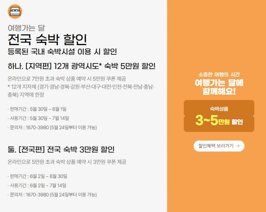 6월 한 달을 여행 가는 날로 정하고 철도, 항공권 등 교통 할인 50%부터 전국의 숙박시설 3만 원에서 5만 원 할인, 놀이공원이나 캠핑장 할인 및 환급 등 여러 종류의 할인쿠폰을 제공합니다. 항목별로 간단히 개요만 확인해 보겠습니다.