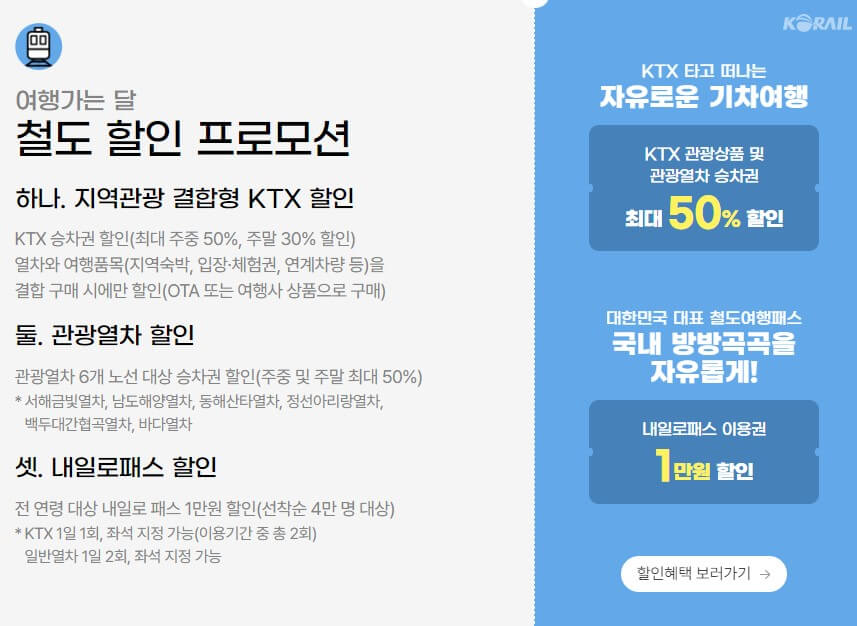 6월 한 달을 여행 가는 날로 정하고 철도, 항공권 등 교통 할인 50%부터 전국의 숙박시설 3만 원에서 5만 원 할인, 놀이공원이나 캠핑장 할인 및 환급 등 여러 종류의 할인쿠폰을 제공합니다. 항목별로 간단히 개요만 확인해 보겠습니다.